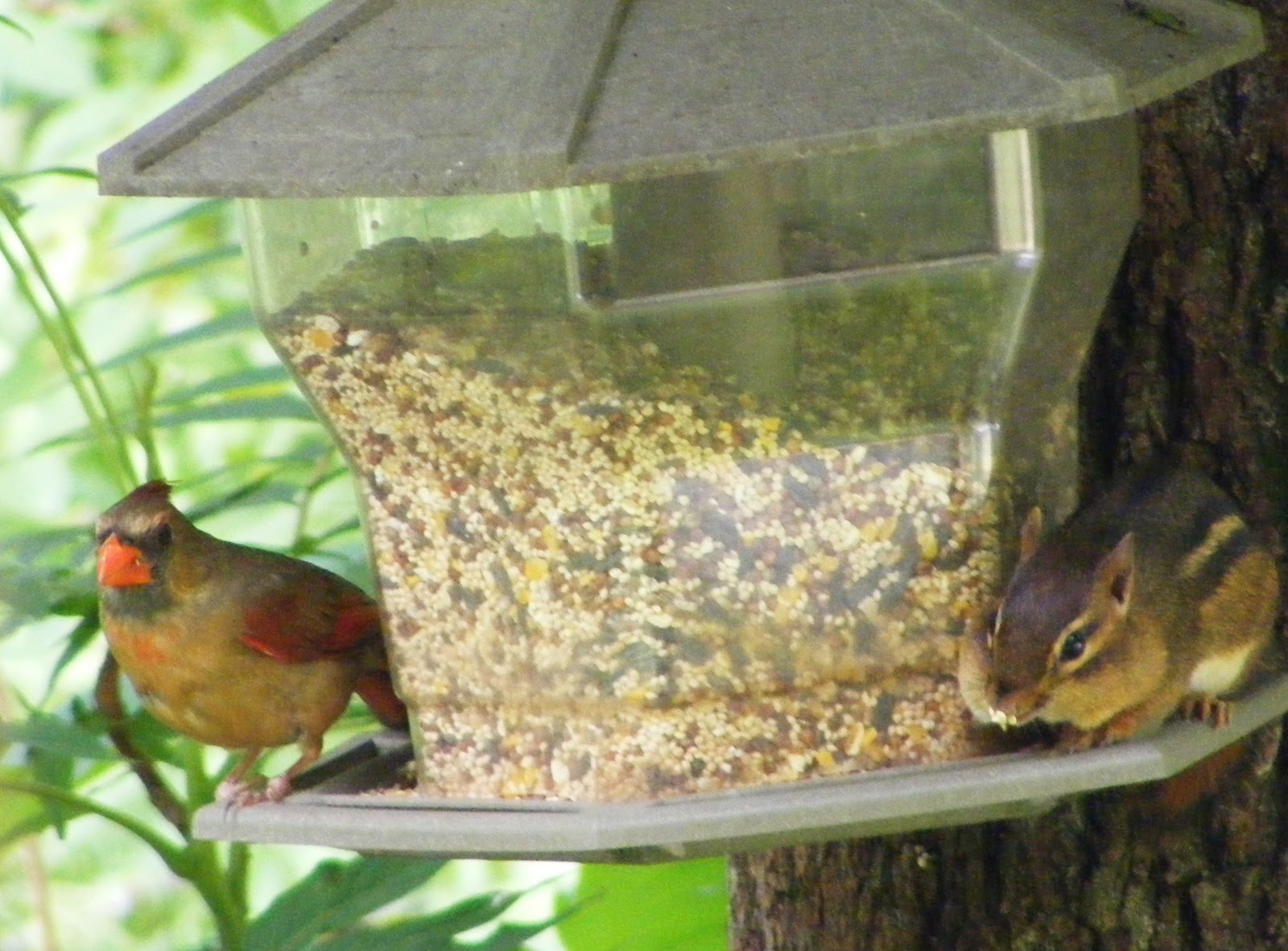 This little guy is cute, but he needs to go away. Bird seed is expensive, and he throws 3/4's of it on the ground as he rummages around, filling those little cheek pouches up. Plus, the birds aren't that happy with him, as you can see.